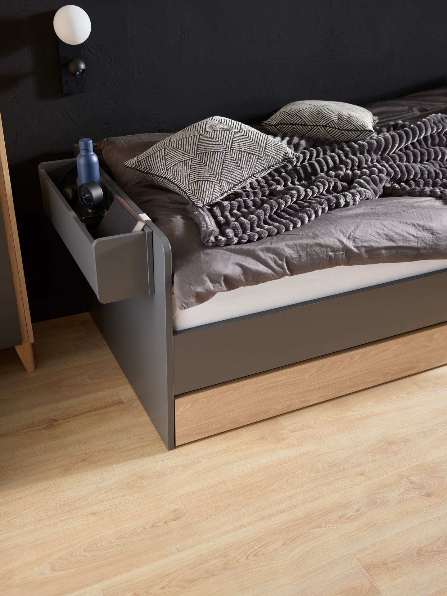 Die Farbe des Ablagefachs können Sie frei wählen – passend zum Bett oder als bewussten Kontrast. Verfügbar sind die drei MUVE-Farben: