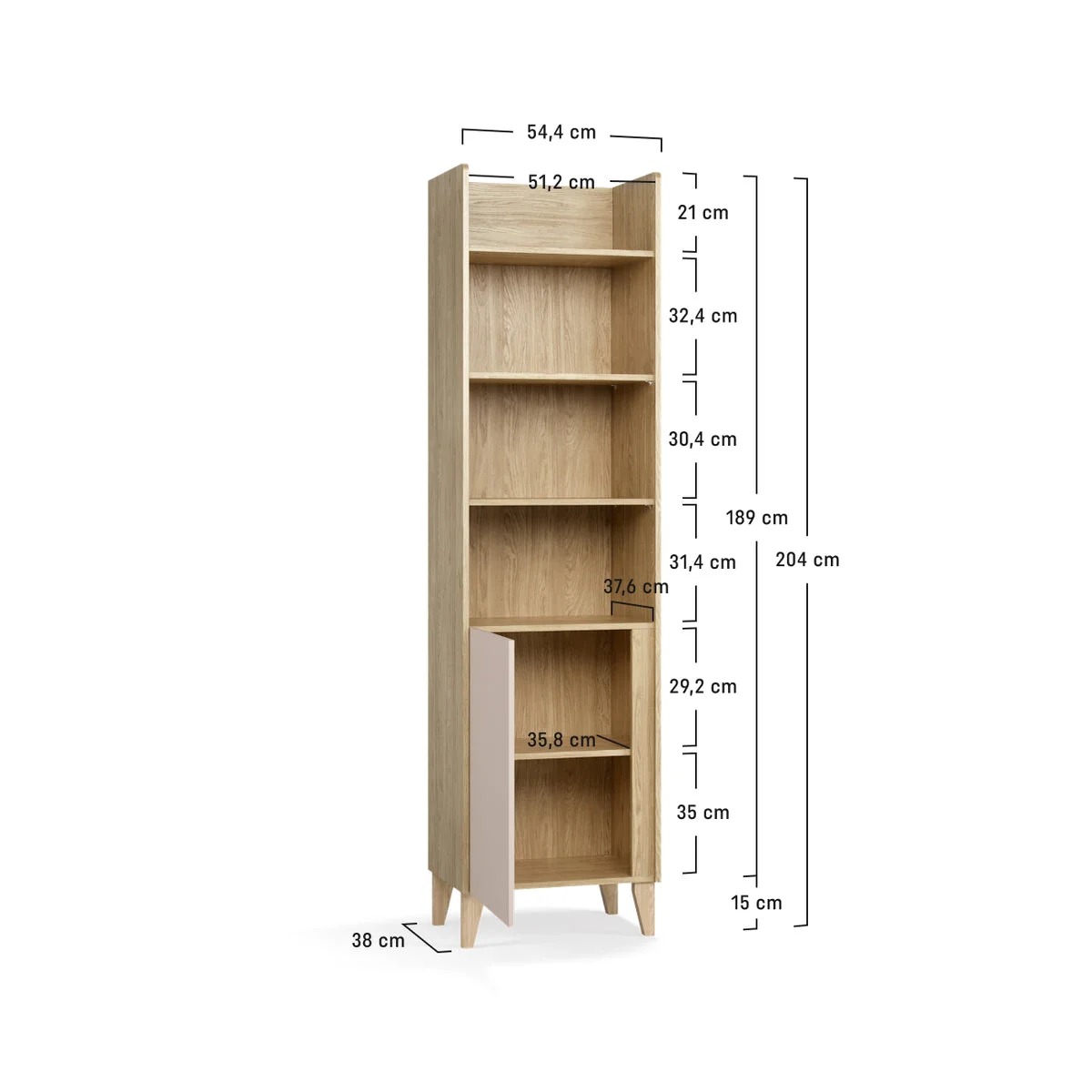 Mit einer Breite von nur 54,4 cm und einer Tiefe von 38 cm passt das Muve-Regal perfekt in Nischen, neben Türen oder als Raumteiler. Die Höhe von 203,7 cm nutzt den Raum bis unter die Decke. Gefertigt aus stabiler 16 mm starker Möbelplatte und HDF-Rückwänden garantiert es Langlebigkeit und Stabilität.