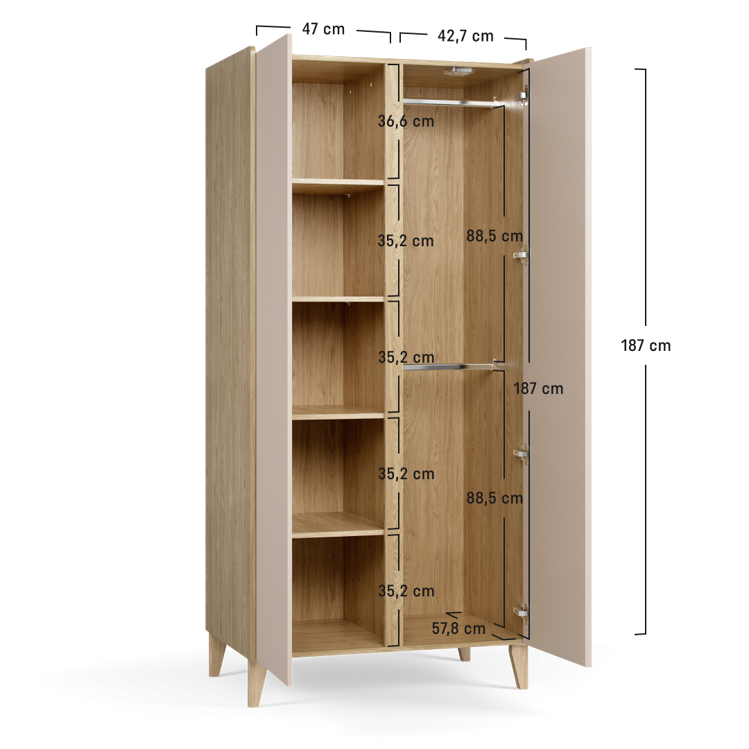 - Hochwertige Massivholz-Details: Die schrägen Füße aus echter Esche verleihen dem Schrank nicht nur eine stabile Basis, sondern auch eine optische Leichtigkeit, die den Raum größer wirken lässt.