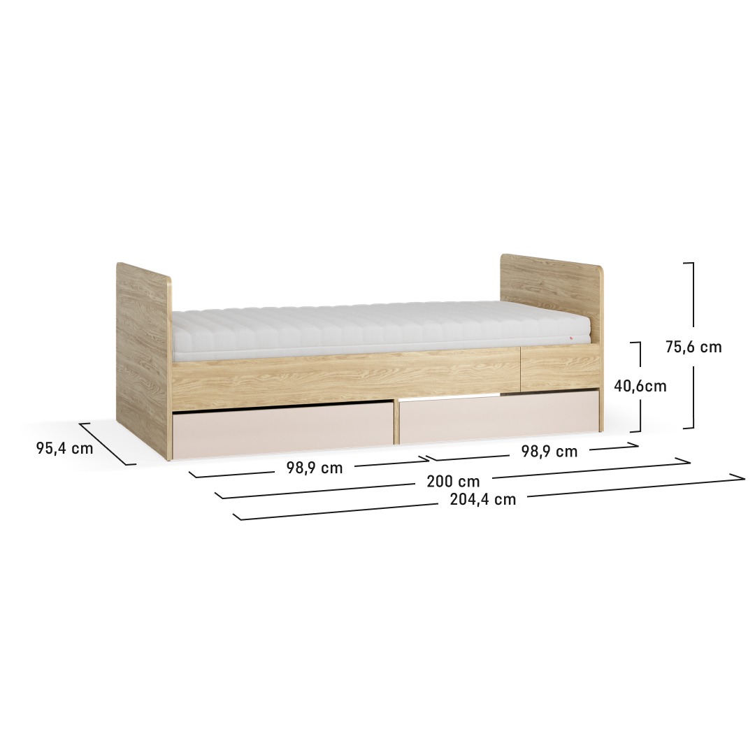 Das Bett misst in der Breite 95,4 cm, in der Höhe 75 cm und in der Tiefe 164,4 cm (ausgezogen 204,4 cm). Der Korpus besteht aus besonders stabiler 22 mm starker Möbelplatte, die übrigen Teile aus 16 mm Möbelplatte. Der Lattenrost ist aus Weichholzlatten gefertigt, der Schubladenboden aus HDF.