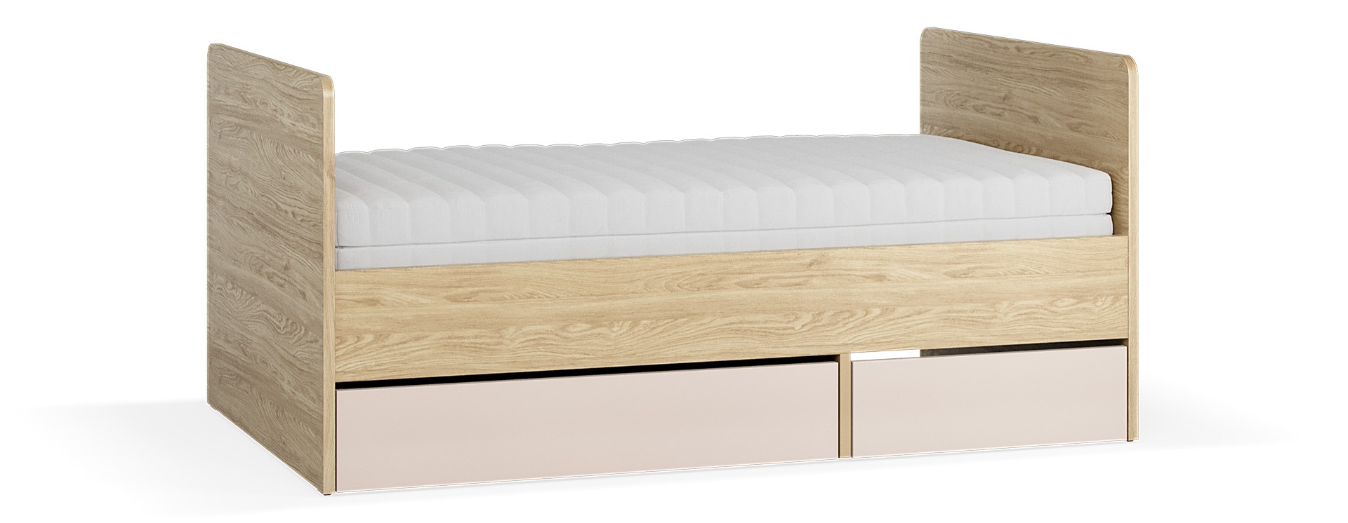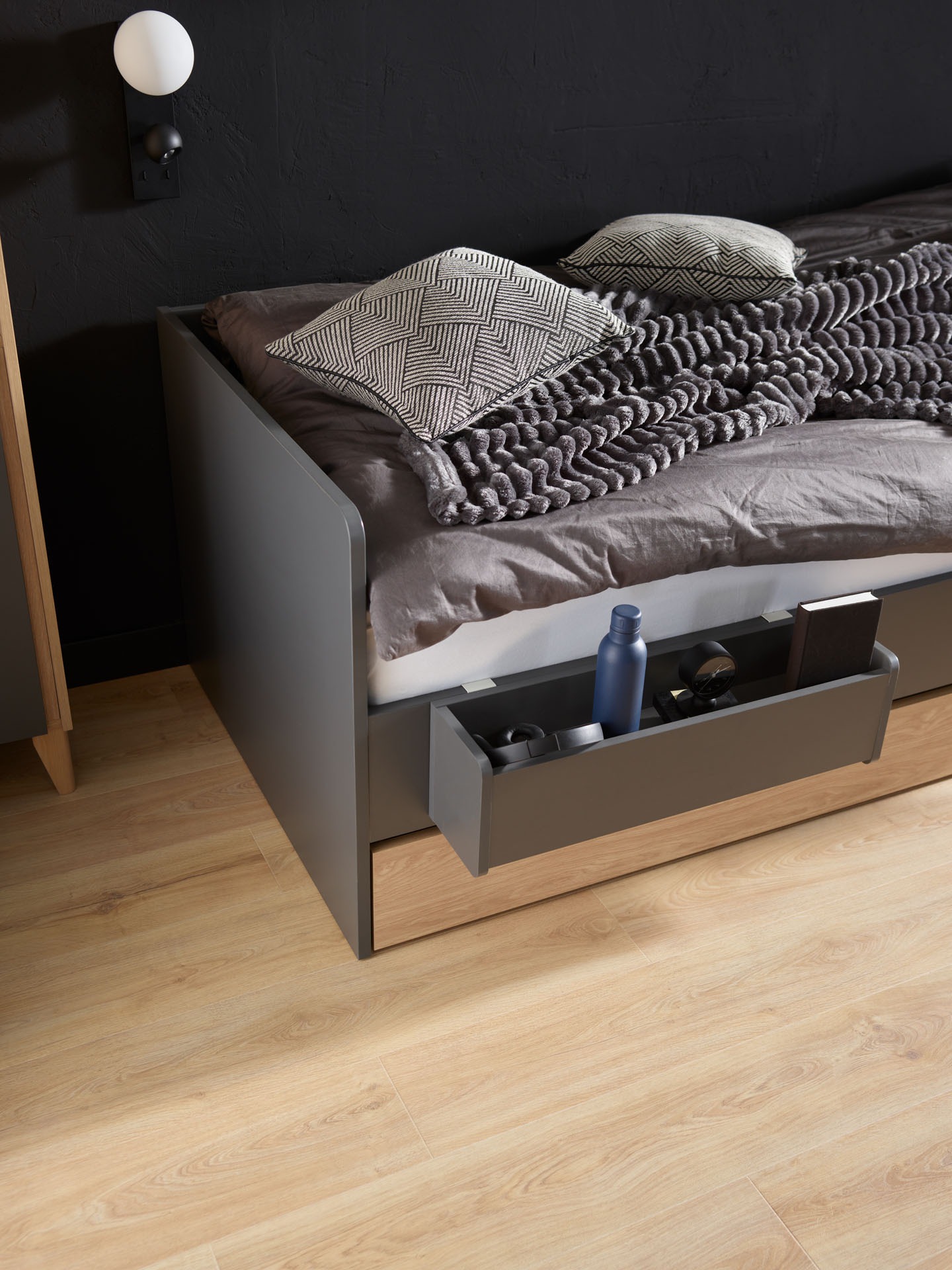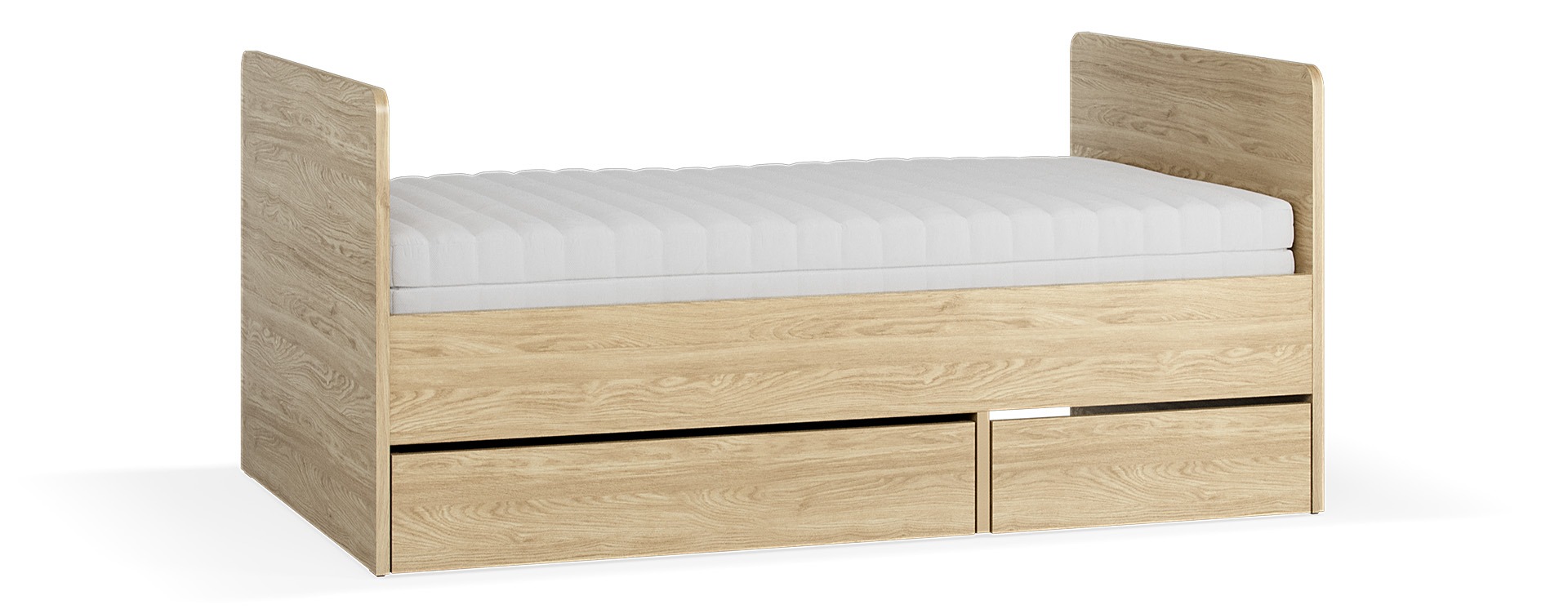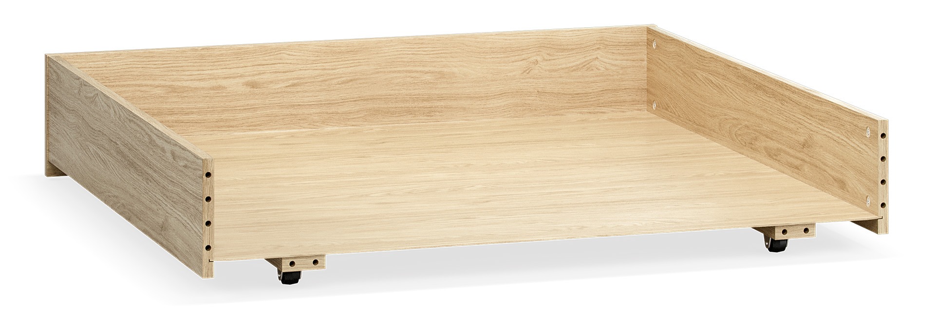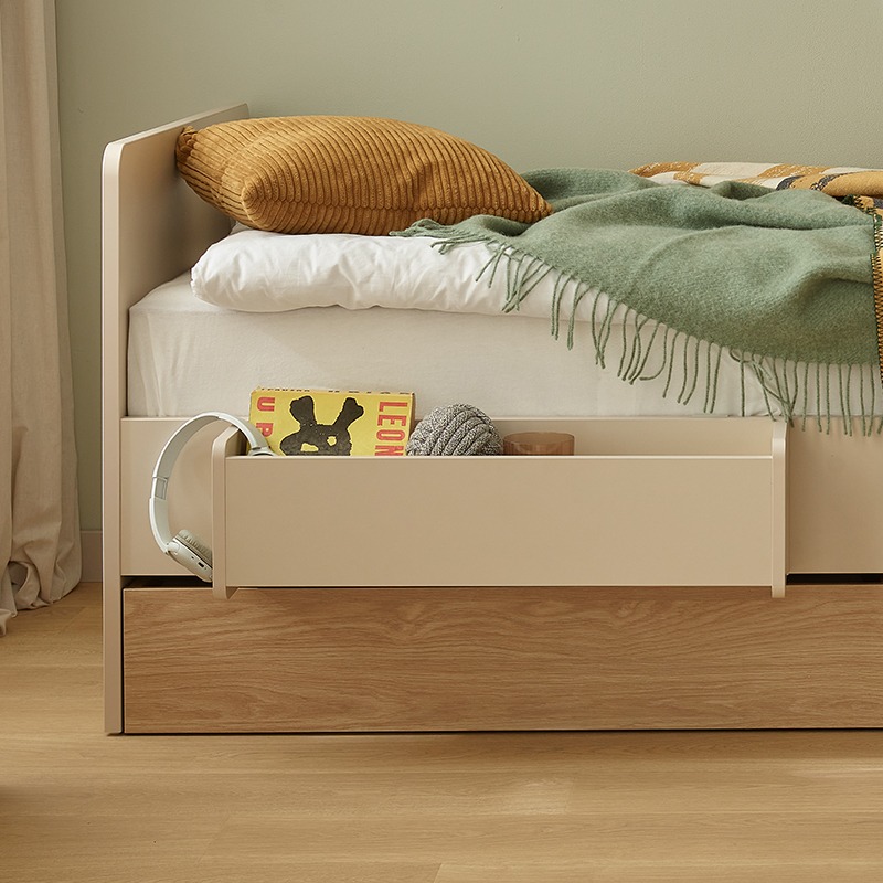 Im unteren Teil des Bettes befindet sich eine große Schublade – perfekt für Bettwäsche, Kissen, Bücher oder Spielzeug. Die Rückseite der Schublade ist ebenfalls in Eiche gehalten und kann als zweite Front genutzt werden.