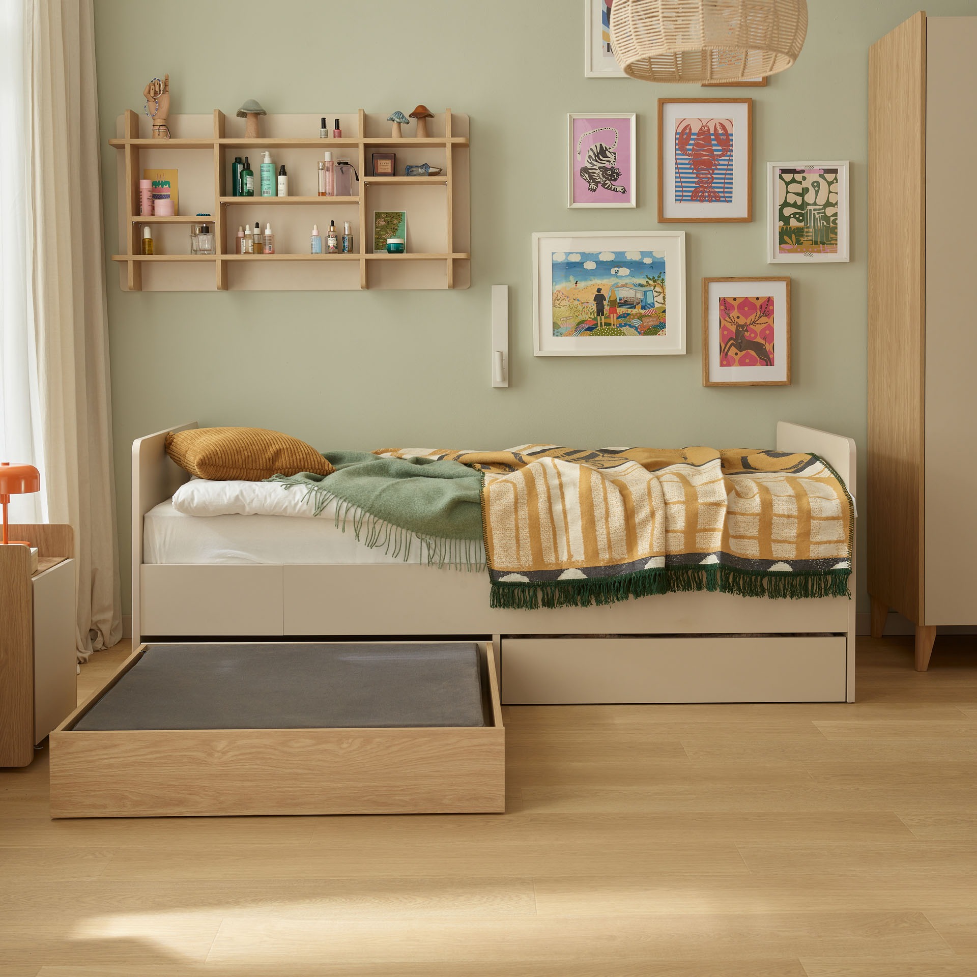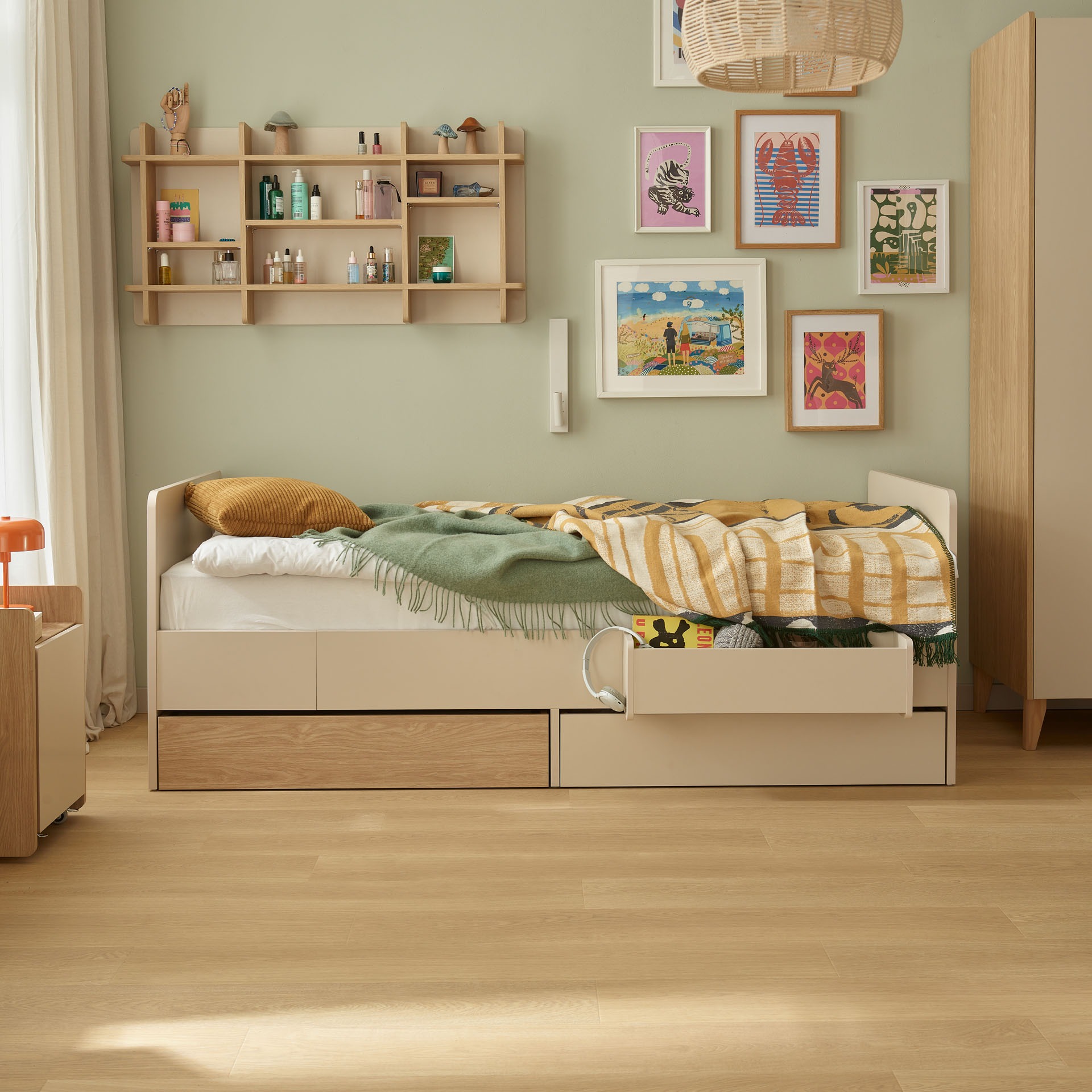 Das Bett harmoniert perfekt mit allen anderen MUVE-Möbeln – vom Schreibtisch über den Container bis zu den Regalen. In der MUVE-Serie finden Sie auch einen ausklappbaren Sessel oder ein Sofa für gemütliche Leseecken. Mit der VOXBOX können Sie die optimale Anordnung vorab visualisieren.