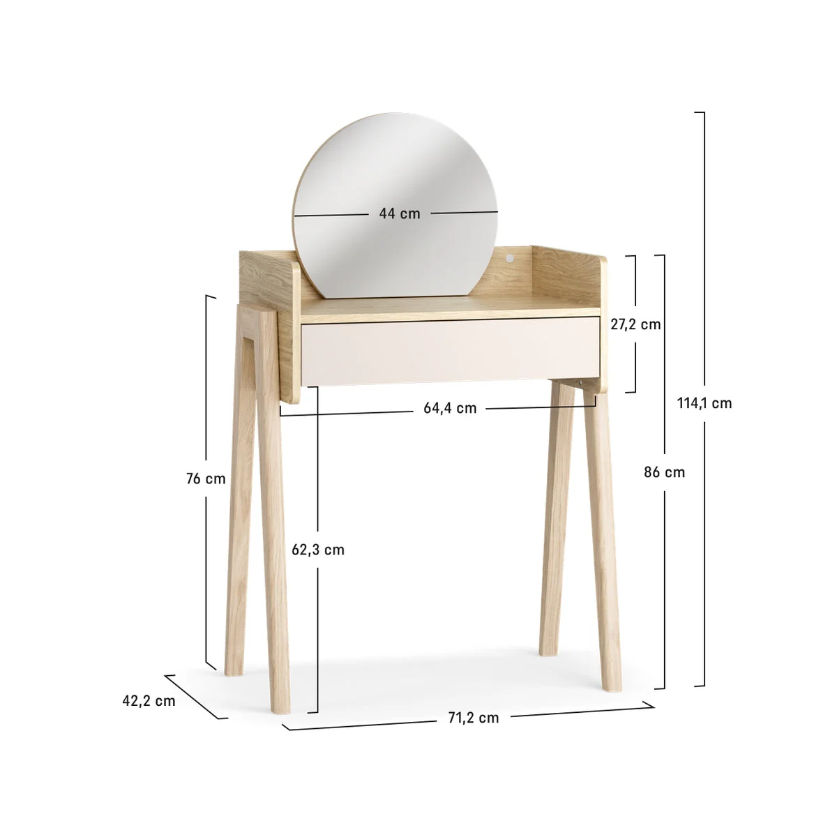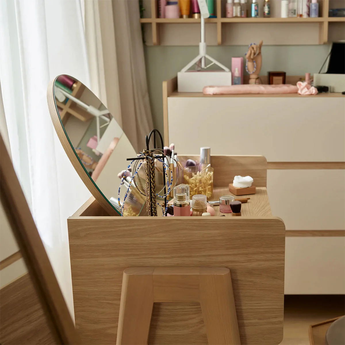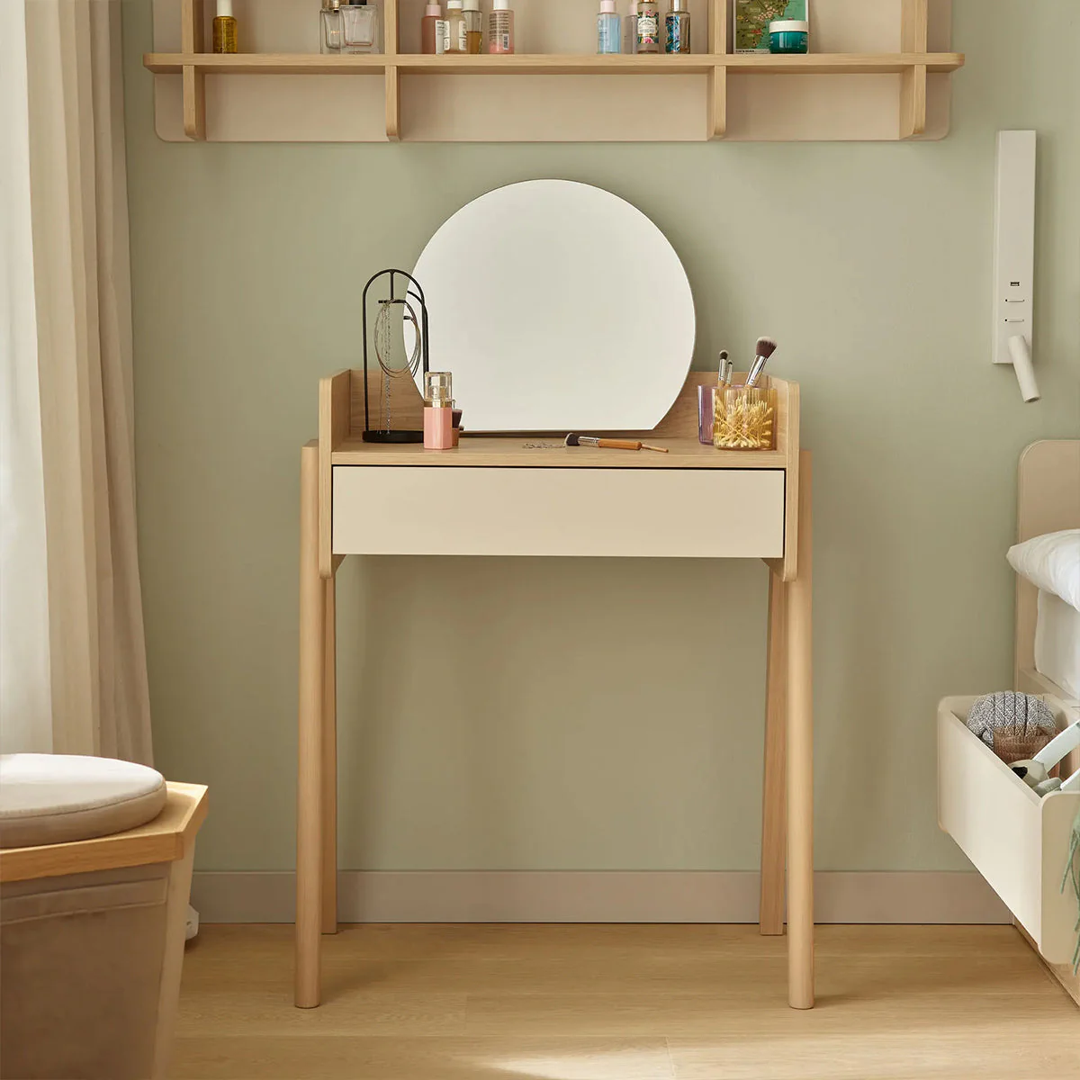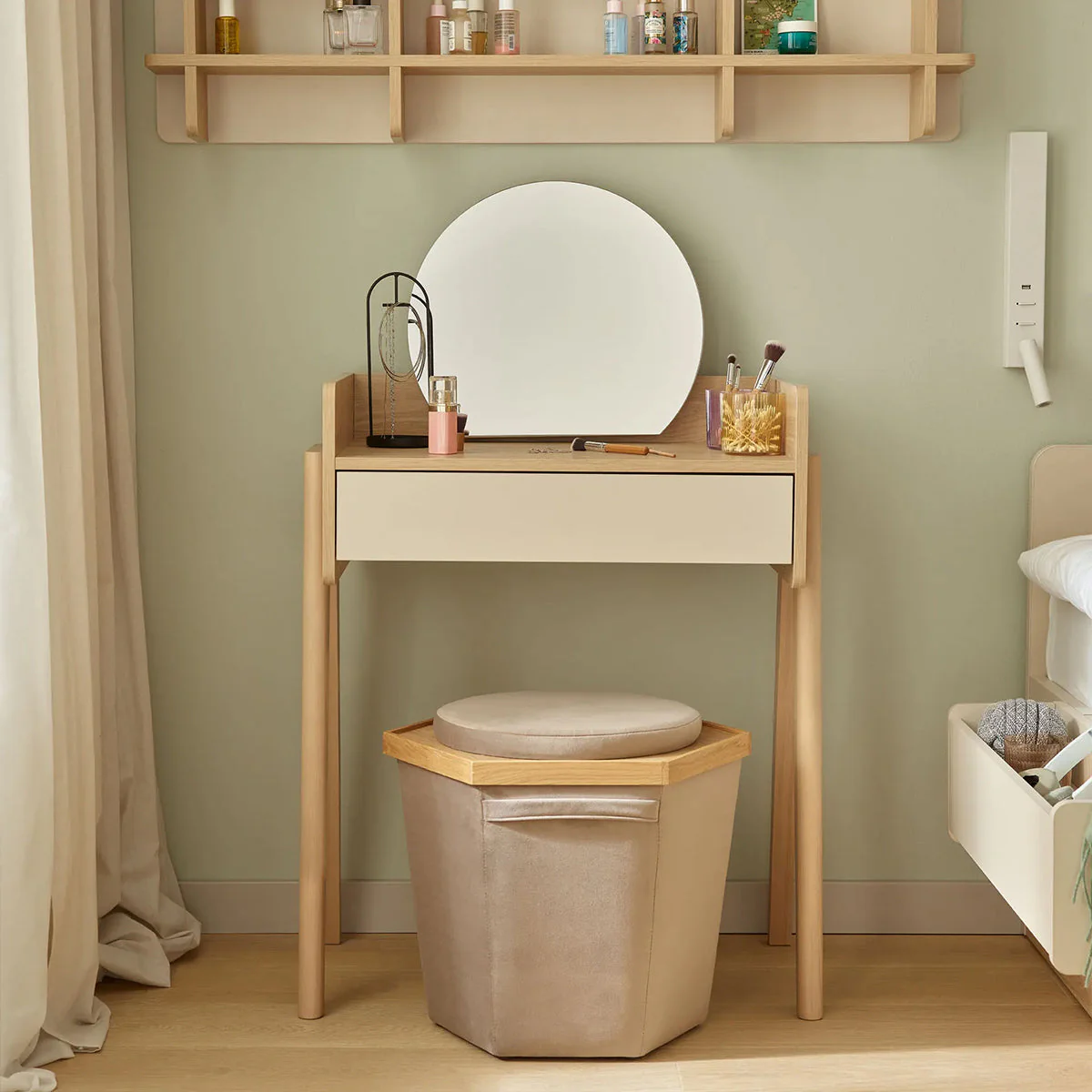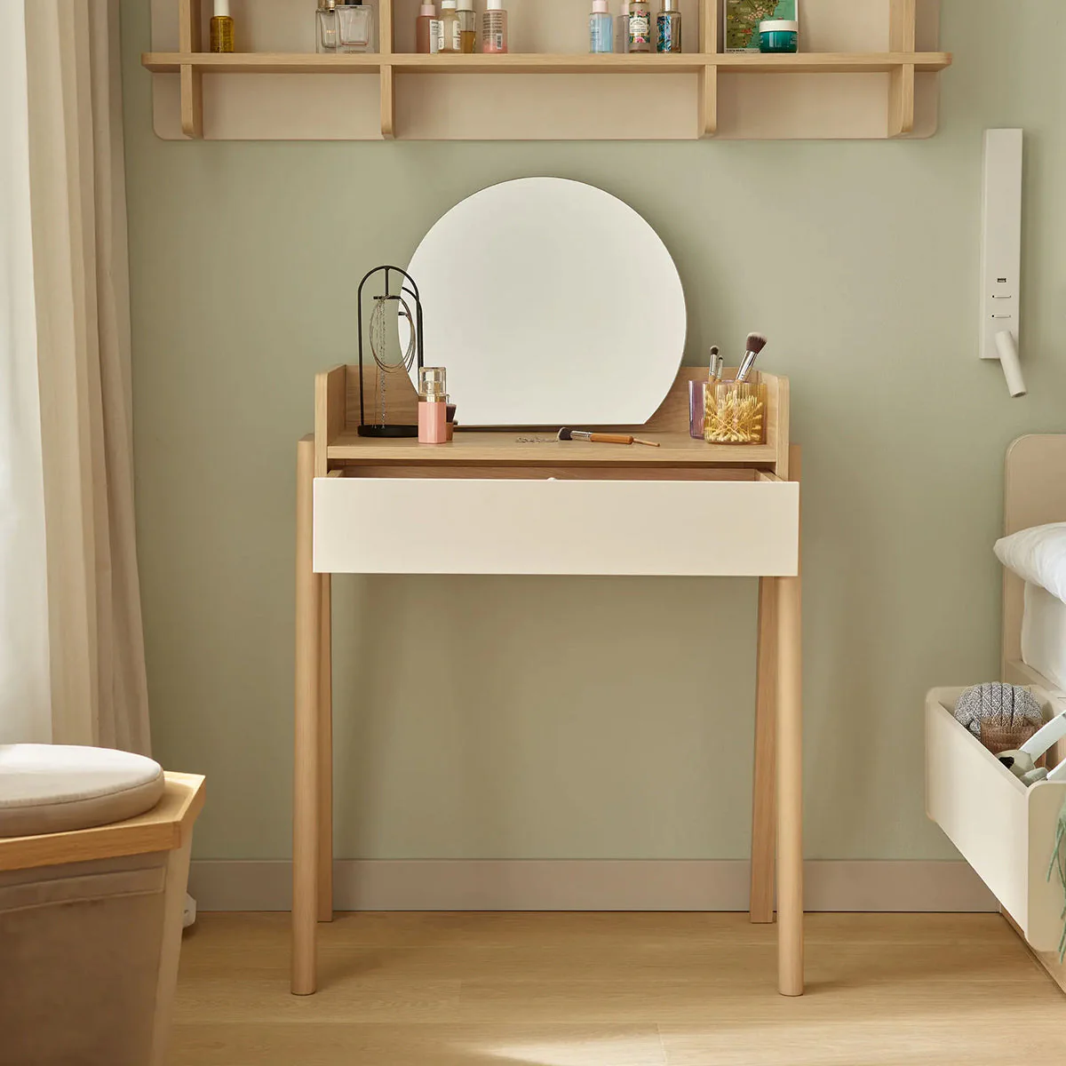 Der Schminktisch MUVE mit Spiegel und Beleuchtung ist die perfekte Ergänzung für moderne Kinder- und Jugendzimmer. Er bietet eine praktische und stilvolle Lösung für die tägliche Pflege, kreative Momente oder als kleiner Arbeitsplatz für Hausaufgaben.