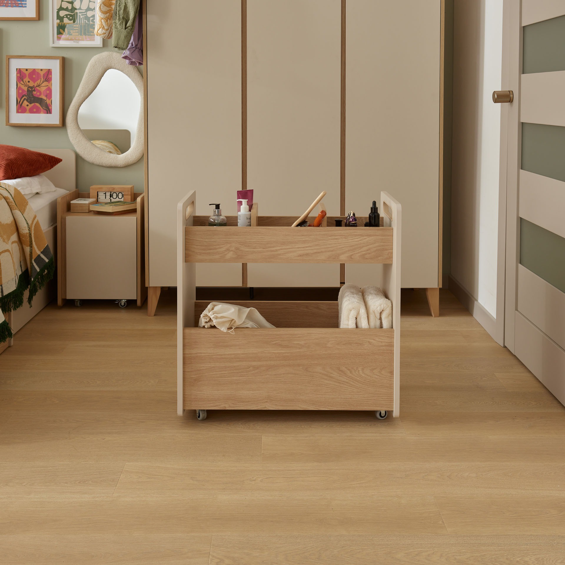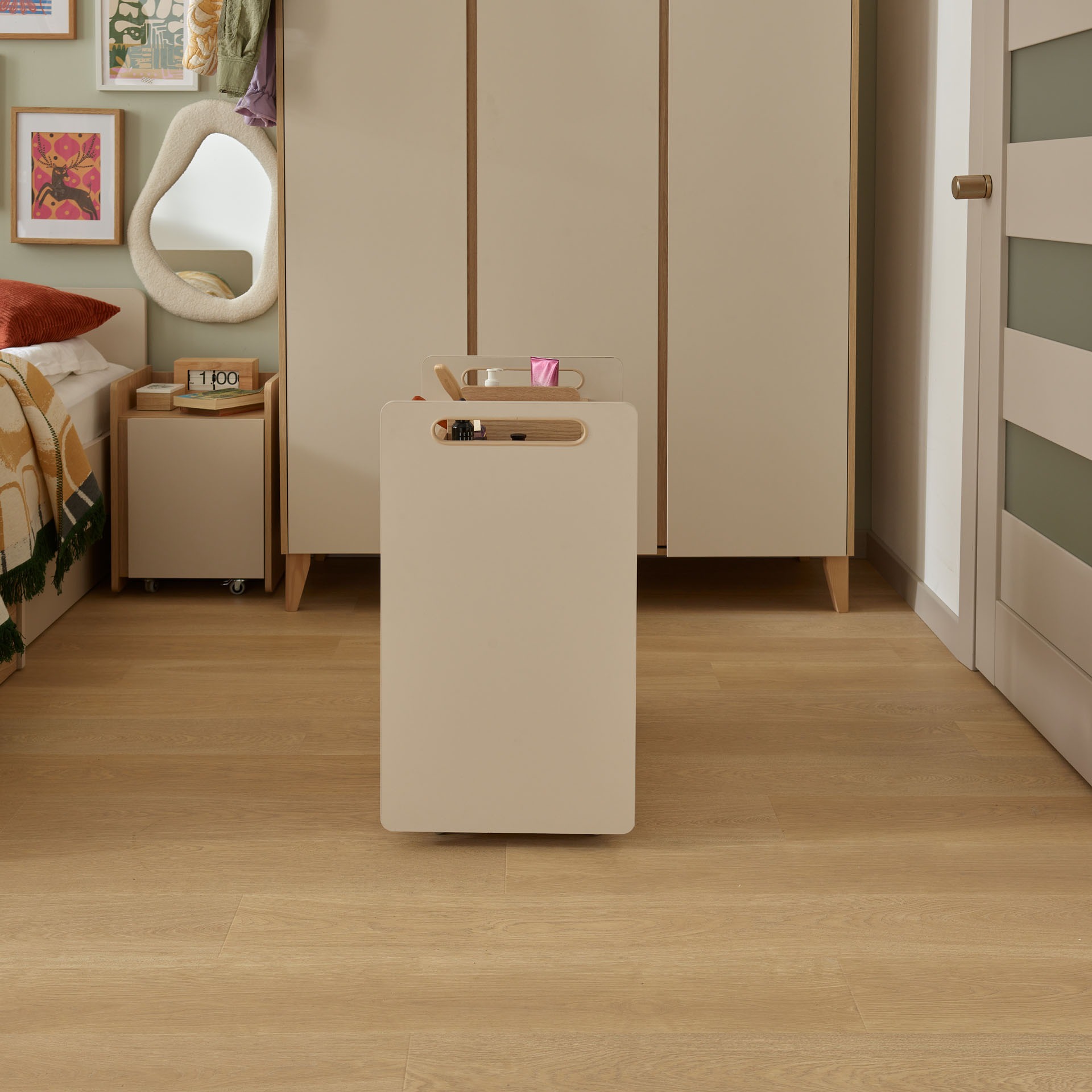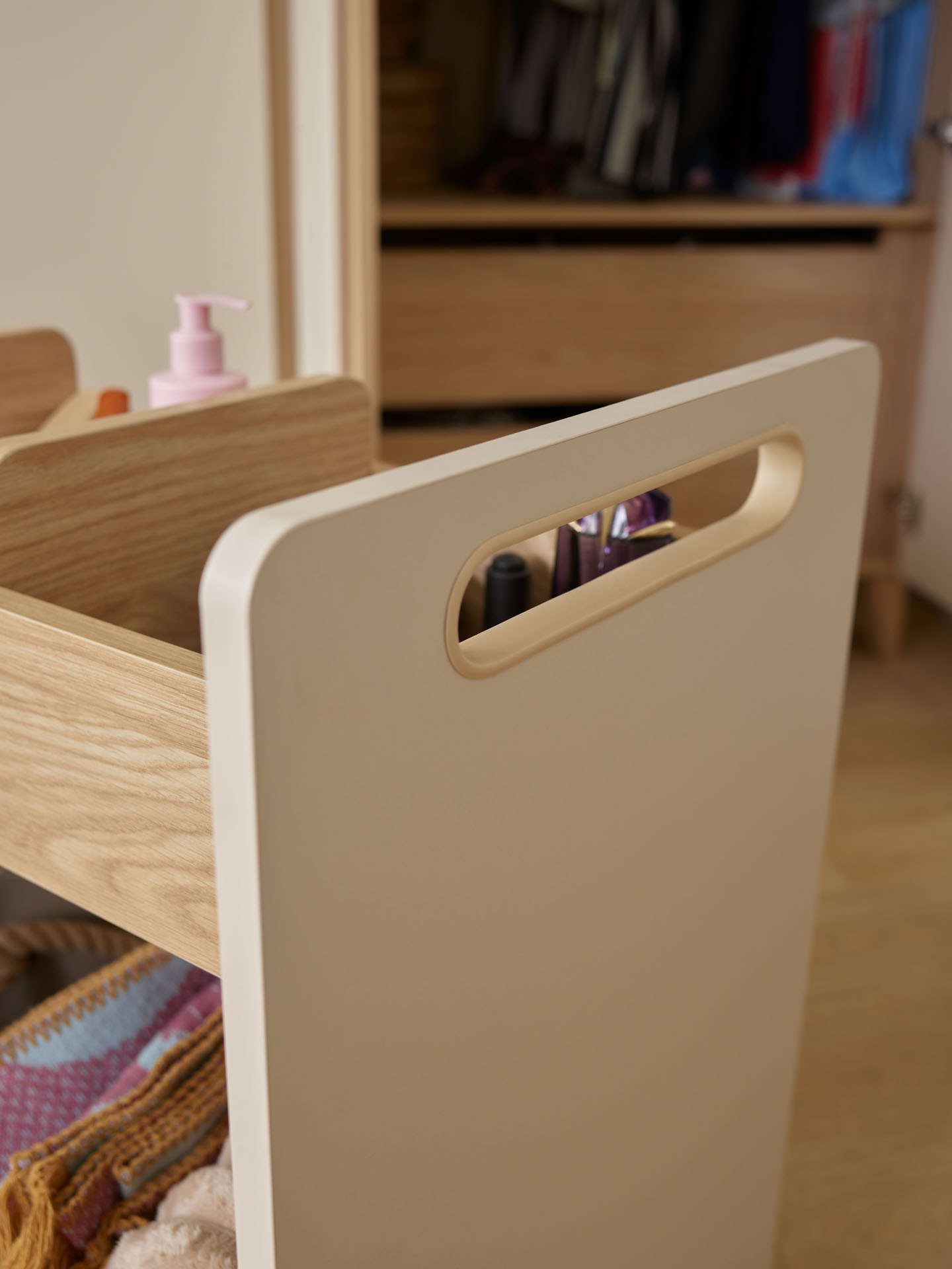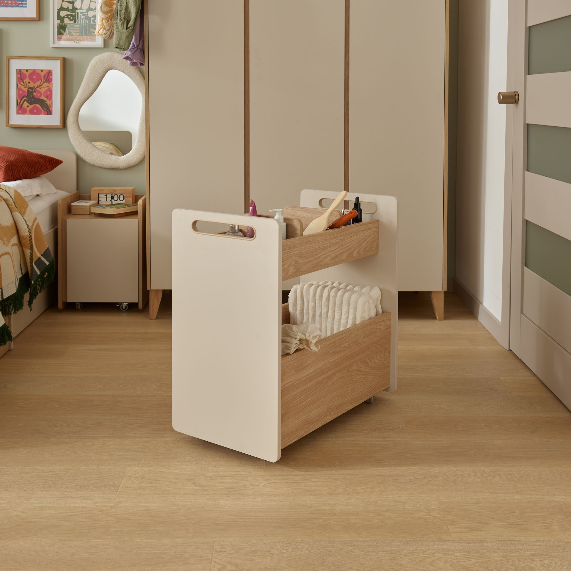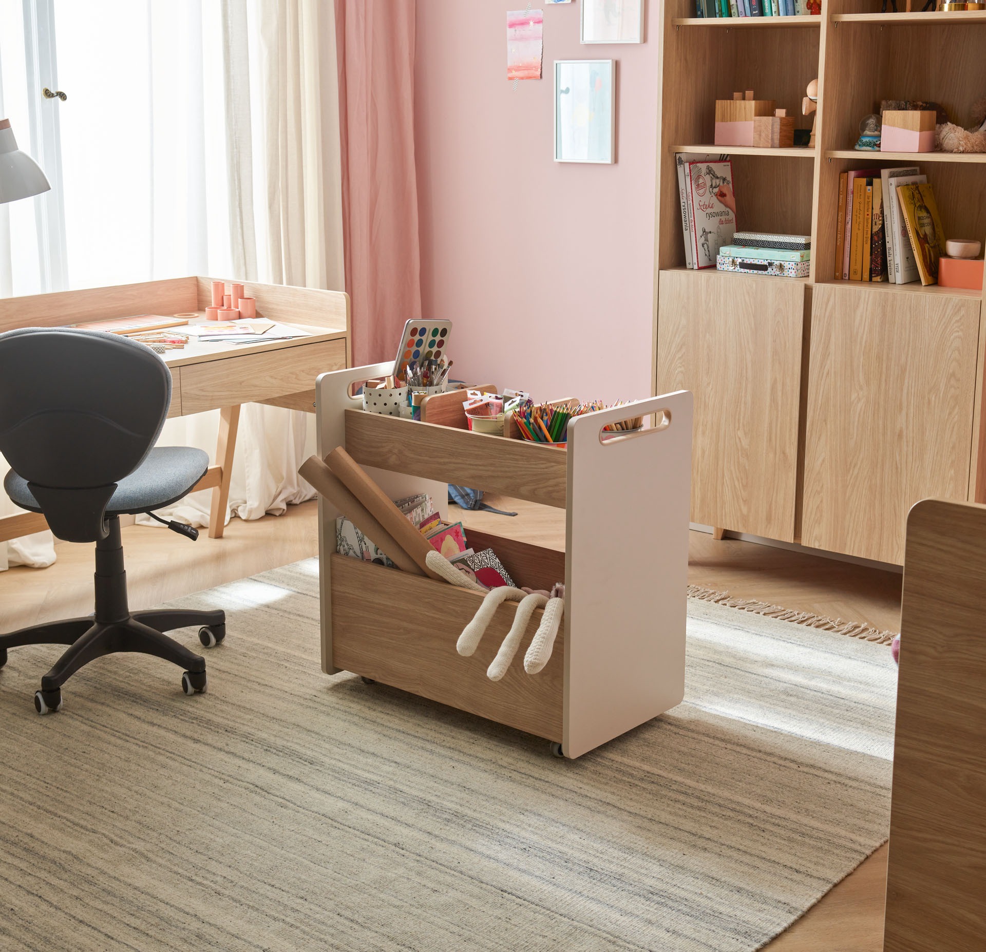 Die flexiblen PVC-beschichteten Griffe sind angenehm zu fassen und sicher in der Hand. Die vier Kunststoffrollen ermöglichen es, den Wagen mühelos von Raum zu Raum zu bewegen – ob ins Spielzimmer, ins Kinderzimmer oder in die Küche zum kreativen Arbeiten. Mit einer Höhe von 71 cm und einer Breite von 70 cm können auch kleinere Kinder den Wagen selbstständig nutzen.