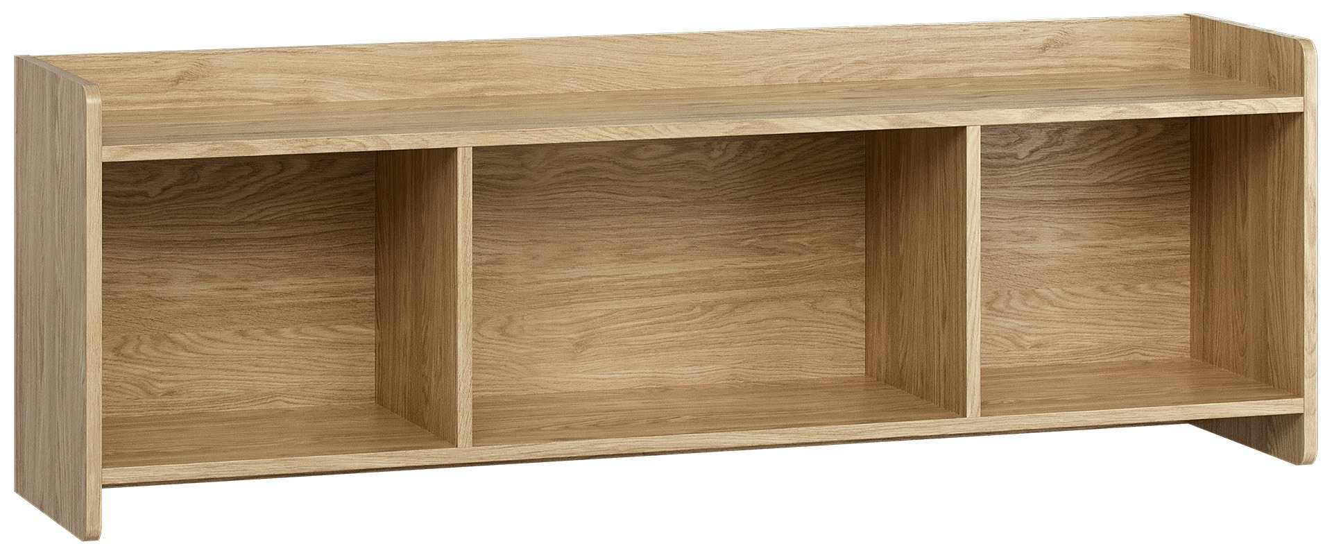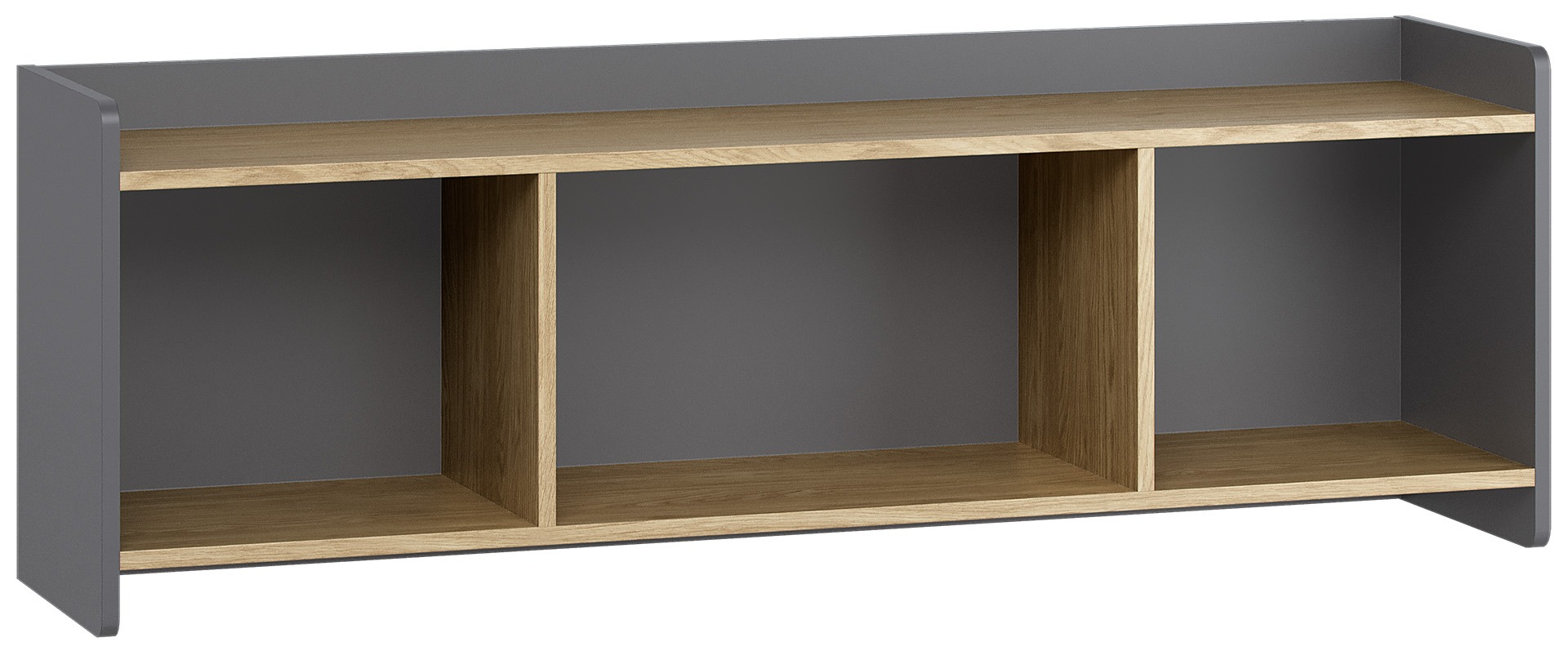 Das Wandregal verfügt über drei großzügige offene Fächer, die sich einzeln oder in mehreren Teilen an der Wand montieren lassen. So können Sie interessante Kompositionen schaffen – ob als durchgehendes Regal über dem Schreibtisch oder als aufgelockerte Anordnung über dem Bett. Die geschlossene Rück- und Seitenwand sorgt dafür, dass auch kleine Gegenstände sicher stehen und nicht herunterfallen können.