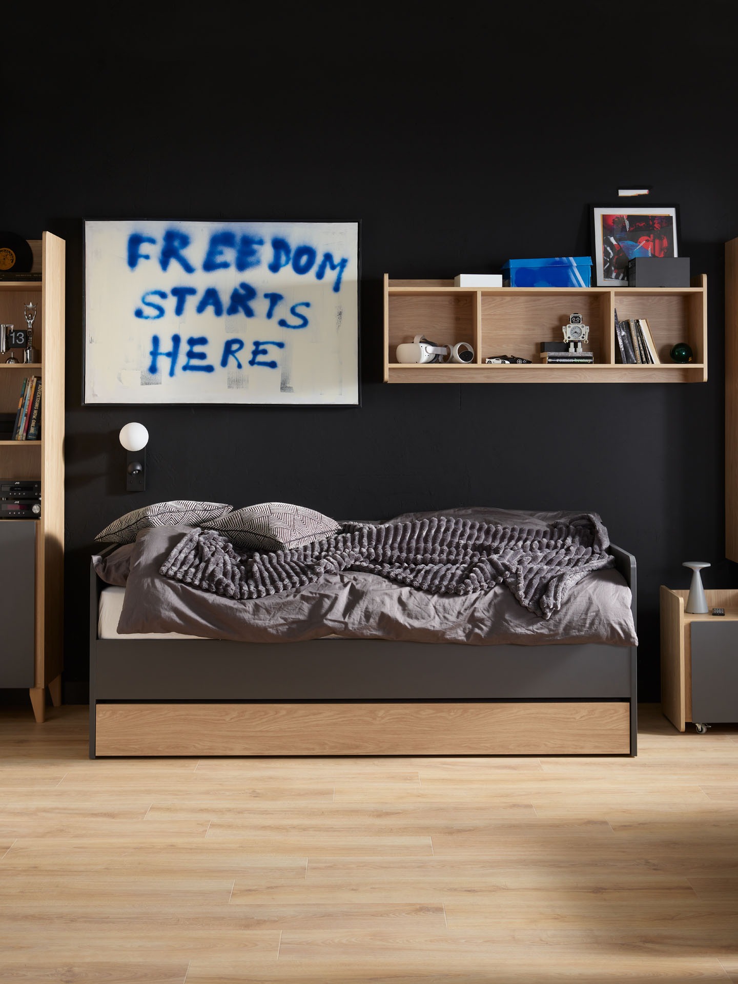 Mit dem Wandregal Muve schaffen Sie im Handumdrehen Ordnung an der Wand – dekorativ, sicher und perfekt abgestimmt auf jedes Kinder- und Jugendzimmer!